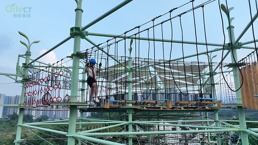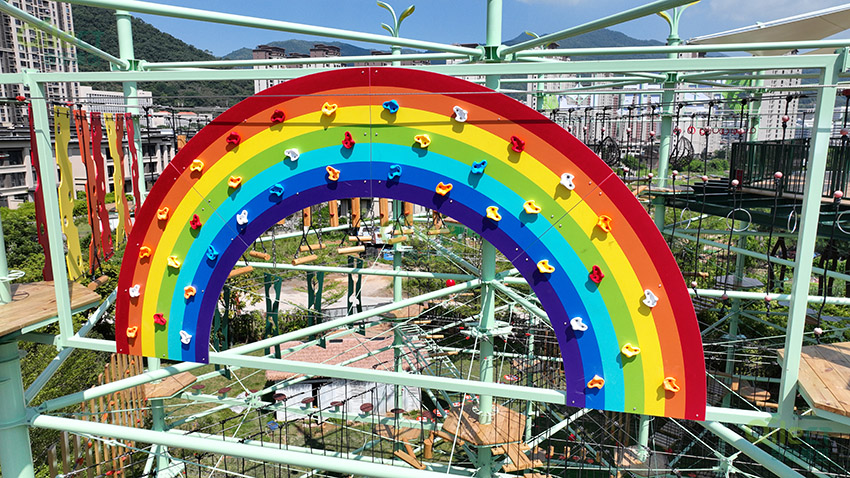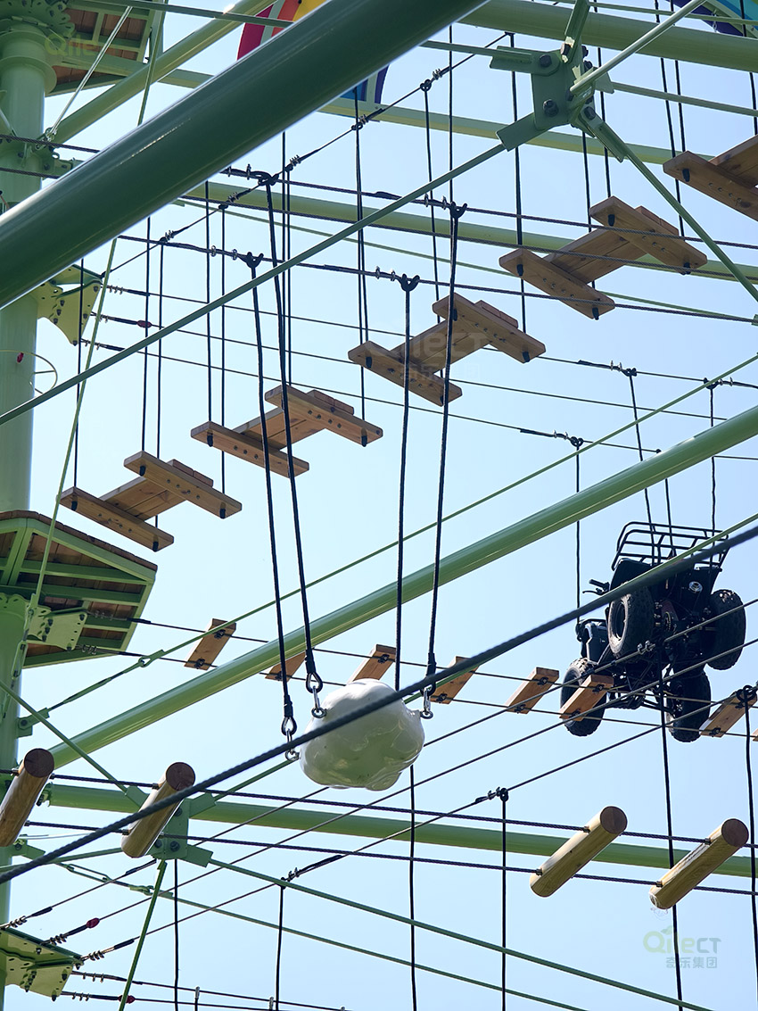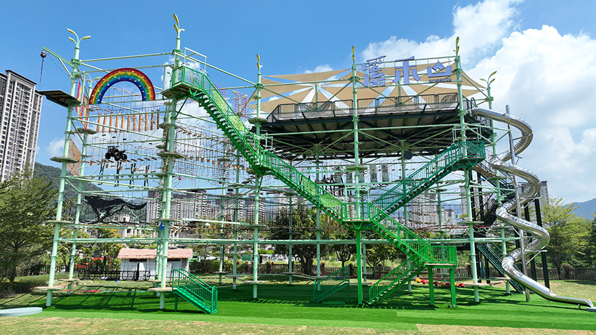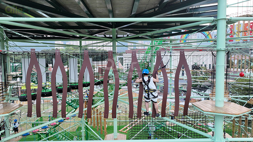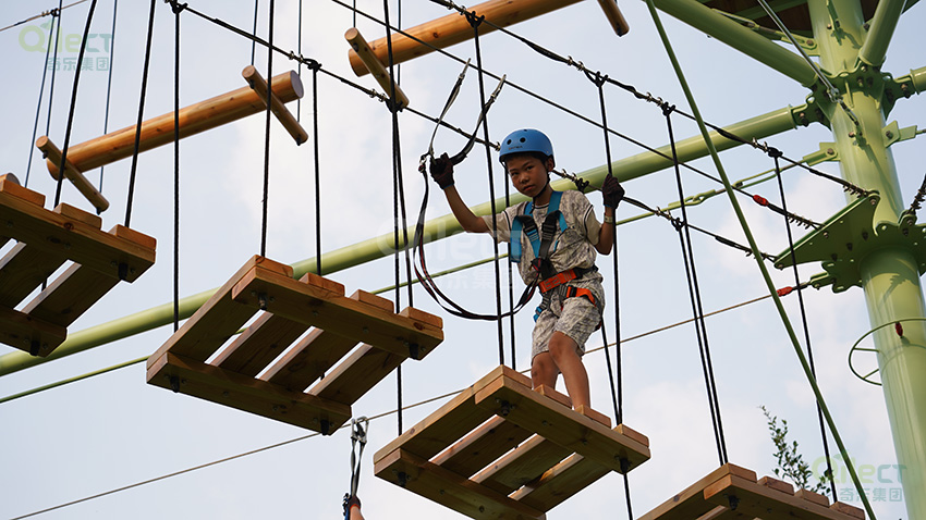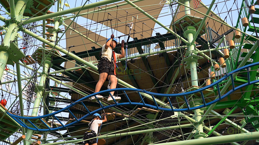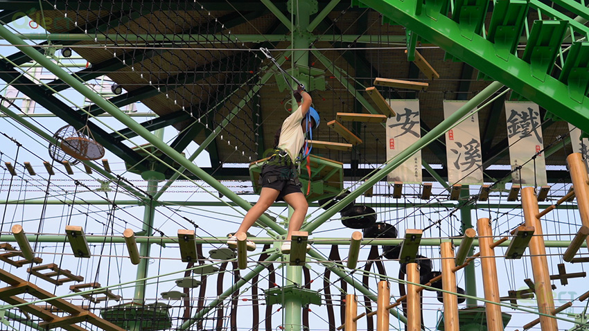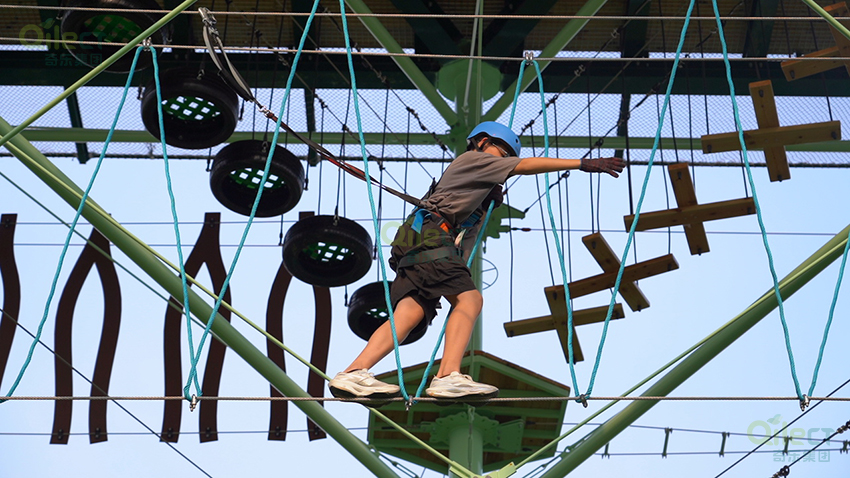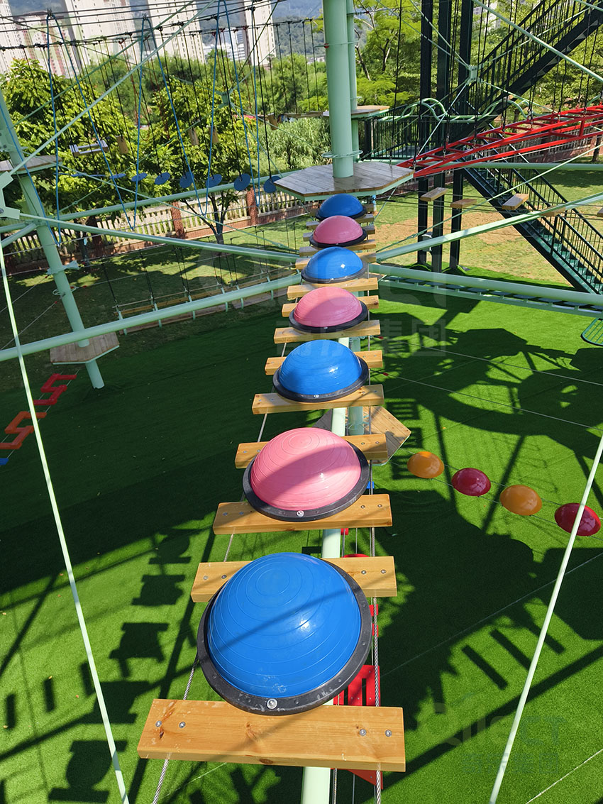 針對6歲以上兒童及初次嘗試的家庭客群,設(shè)置時空網(wǎng)道、蛇形橋、I LOVE YOU、蘑菇橋、阻礙木、茶則滑板、匍匐前進、XIHESHAN、障礙高低樁、蹺蹺板等較低難度項目。