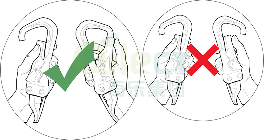 1、按下登山扣門打開解鎖的掛鉤,第二個(gè)登山扣保持鎖定狀態(tài)。