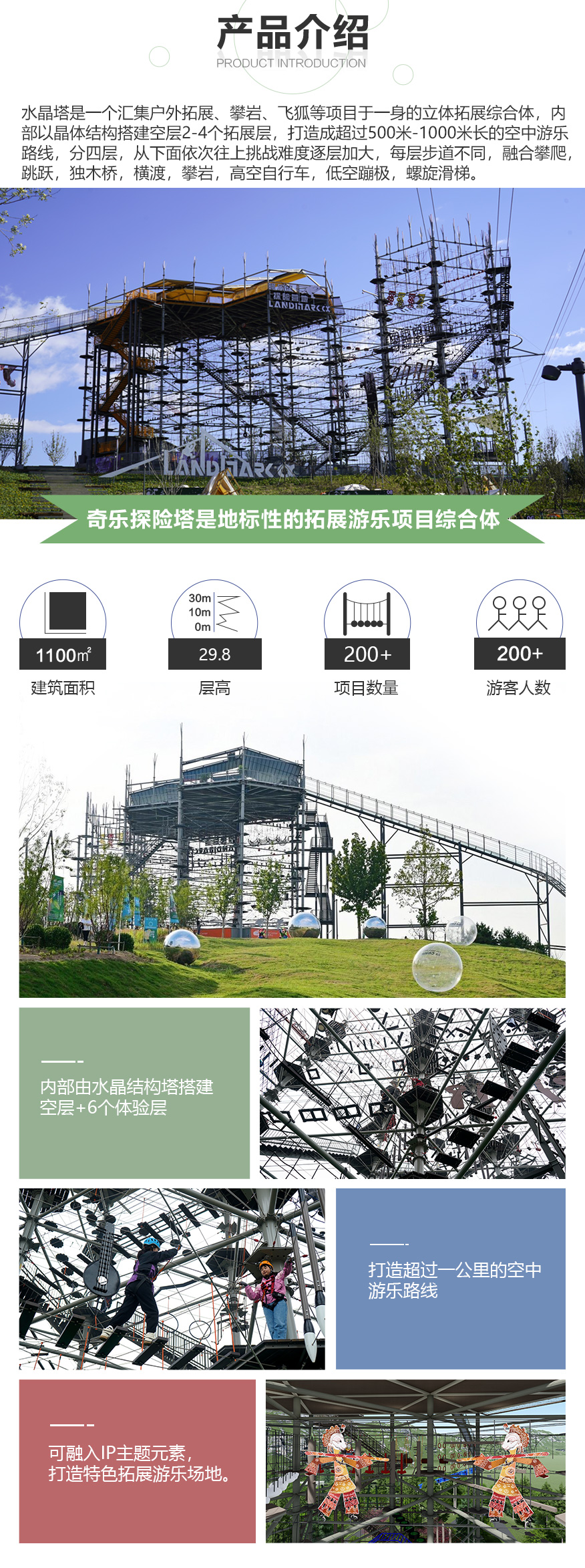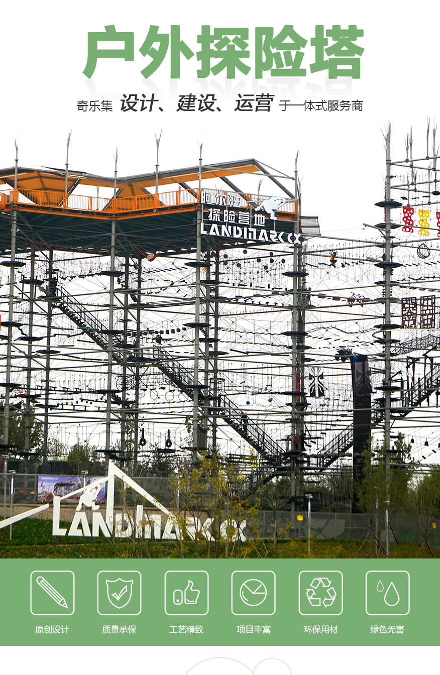 匯集 200 種游樂步道,適合廣大游客 水晶塔集冒險、運動、娛樂、挑戰于一體的綜合游樂類項目,通過在塔內設置并搭建各種難易不同、風格迴異、超強刺激的步道關卡,讓游客體驗高空墜落與自由滑翔的快感,感受塔內項目攀爬穿越的刺激。水晶塔是一個創新且極具盈利能力的全新休閑旅游項目,適合建在戶外,也可以建在窒內。 晶體結構,更穩固,更安全 水晶塔采用品體結構設計,每4根立柱為1個晶體結構,可根據客戶需求自由組合,晶體結構設計更大的增加設備的穩定性、利用率,保證客戶場地的實用率最大化,立柱之間做連桿支撐,根據結構設置觀景臺,可達 80~1000+m?,可作為餐飲,休閑吧,咖啡吧,酒吧等休閑休息區域,平臺下方懸空架連接桿支撐,平臺可同時承載 30-1000+人。 搭配我司自主研發生命系統,保障安全無死角自主研發自鎖式雙掛鉤,相互交替型安全保障永遠保證有一個掛鉤自鎖在鋼絲繩上面,保障安全無死角。